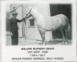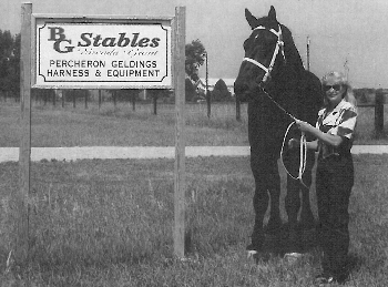 Brenda Grant is a fourth generation horse dealer that has established her-self as a competent and honest trader of Percheron geldings, harness, wagons, fancy carriages, sleighs, cutters and occasionally, a Halflinger or two. She's been at it full time for just eight years, but she's got a lifetime of experience to back her up. Her great-grandfather, James Almira Grant, 1846 to 1927, was a buyer and shipper of horses. He lived in Fredericktown, Ohio, home of the Percheron Horse Association of America. Her grandfather, William Runnion Grant, 1884 to 1967, traded horses out of his livery in Van Wert, Ohio. William was also involved in training Standardbreds. Her father, Robert E. Grant, at seventy-nine, is still active in trading horses, equipment and horse trailers. He also has a small tack shop, moving mostly saddles and harness. Brenda grew up under his motto, "Everything is for sale, except the wife and kids, and they might be for sale, too."